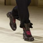 Destaque para uma parte da vestimenta para a qual não costumamos dar muita bola: os punhos das camisas. Aqui, eles aparecem maximizados, coloridos, com vida própria, sem necessariamente estarem acoplados a uma camisa tradicional. Nos pés – que marcharam ao som de bandas gótico-punks obscuras dos anos 1970 e 1980, como a irlandesa Virgin Prunes e a nova-iorquina Suicide – botas tratoradas, ao melhor estilo coturno, amarradas com cadarços de cores contrastantes, assinatura punk, mas também com utilidade no universo dos pescadores e estivadores. Em tempos incertos, mais vale play safe e reinventar clássicos ao invés da roda.