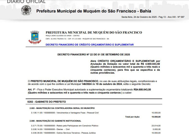 A Prefeitura de Muquém do São Francisco (BA) publicou no Diário Oficial do Município de sexta-feira, 24 de outubro de 2025 (Ano XIII, nº 587, pág. 19) o Decreto Financeiro nº 22, de 1º de setembro de 2025, que abre crédito orçamentário e suplementar no valor de R$ 4.600.043,50 (quatro milhões, seiscentos mil e quarenta e três reais e cinquenta centavos), por anulação de dotações de diversas secretarias municipais.