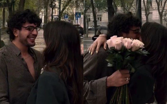 No registro, o cantor oficializou a relação com a ex-BBB com a música Lisboa, da dupla Anavitória. Em um dia chuvoso, o performer se ajoelhou com um buquê de flores e perguntou se a atriz gostaria de ficar com ele.