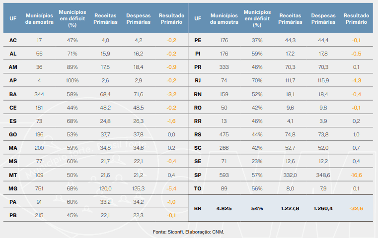 A entidade já considerava o cenário em 2023 preocupante, quando 51% dos municípios estavam no vermelho, com um déficit de R$ 17 bilhões. O novo estudo revela que, agora, a deterioração é mais generalizada, afetando os entes independentemente do porte populacional. Além disso, dos 26 estados, 19 também acumulam déficits primários referentes a 2024.