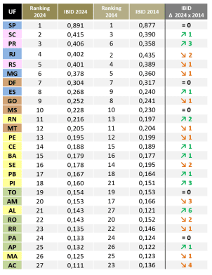 Em 2014, o pior desempenho foi obtido pelo estado de Alagoas, que ocupou a última posição do ranking, com 0,121 pontos. No ano passado, a unidade da federação conseguiu subir seis colocações, fechando 2024 em 21°, com 0,143 pontos. No balanço mais recente, a última posição foi ocupada pelo Acre, que caiu quatro posições, com 0,111 pontos.