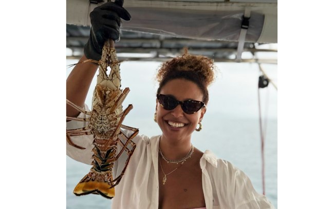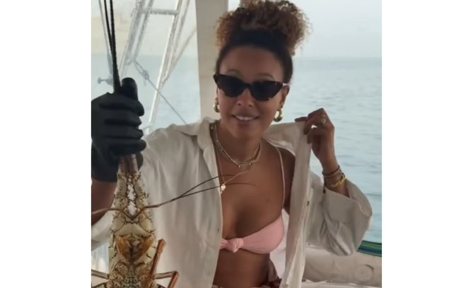 A artista aparece sentada na proa do barco, onde estava usando um biquíni rosa claro, aproveitando bastante o sol e o mar. Ela continuou sorridente, além de segurar uma lagosta grande pescada, e celebrou a ocasião.