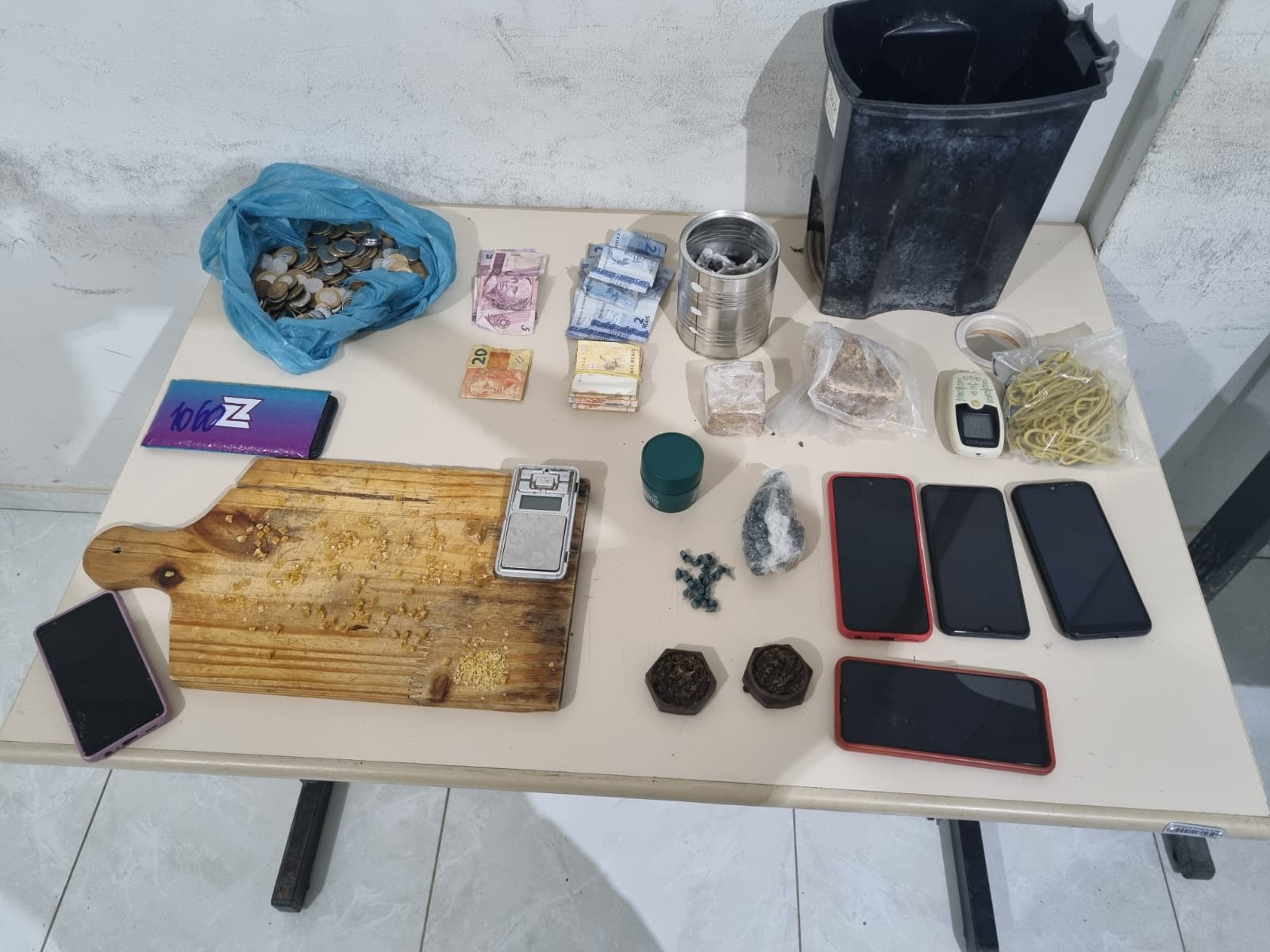 Com autorização dele e de sua esposa, a equipe entrou na residência e localizou, além dos objetos furtados, drogas (crack e maconha), balança de precisão, dinheiro, celulares e outros materiais relacionados ao tráfico, escondidos em diferentes pontos da casa.