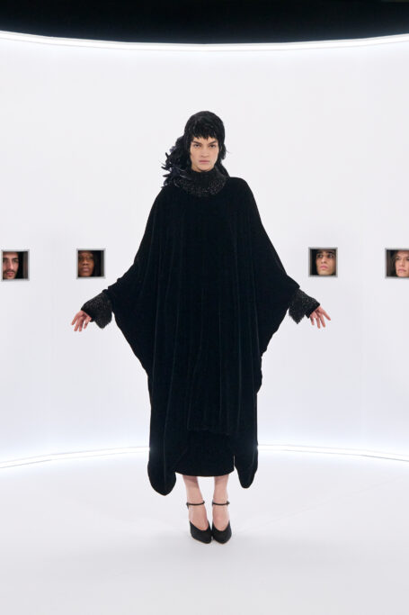 Essa espiadinha na cabine tinha um tempo certo, para que o carrossel de imagens seguisse trocando a “foto”. Assim foi no desfile, em que as modelos performaram poses glamourosas no curto tempo de exposição. A respeito disso, Michele também traça um paralelo com o voyeurismo, a contemplação, o que é íntimo e o que é distante. Ali, a alta-costura – e seus detalhes preciosos – ganham ainda mais importância.