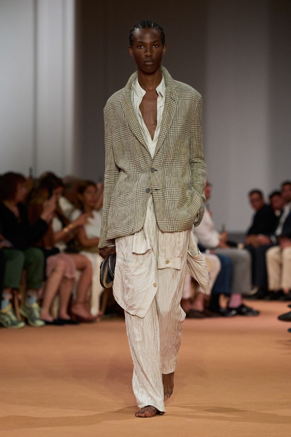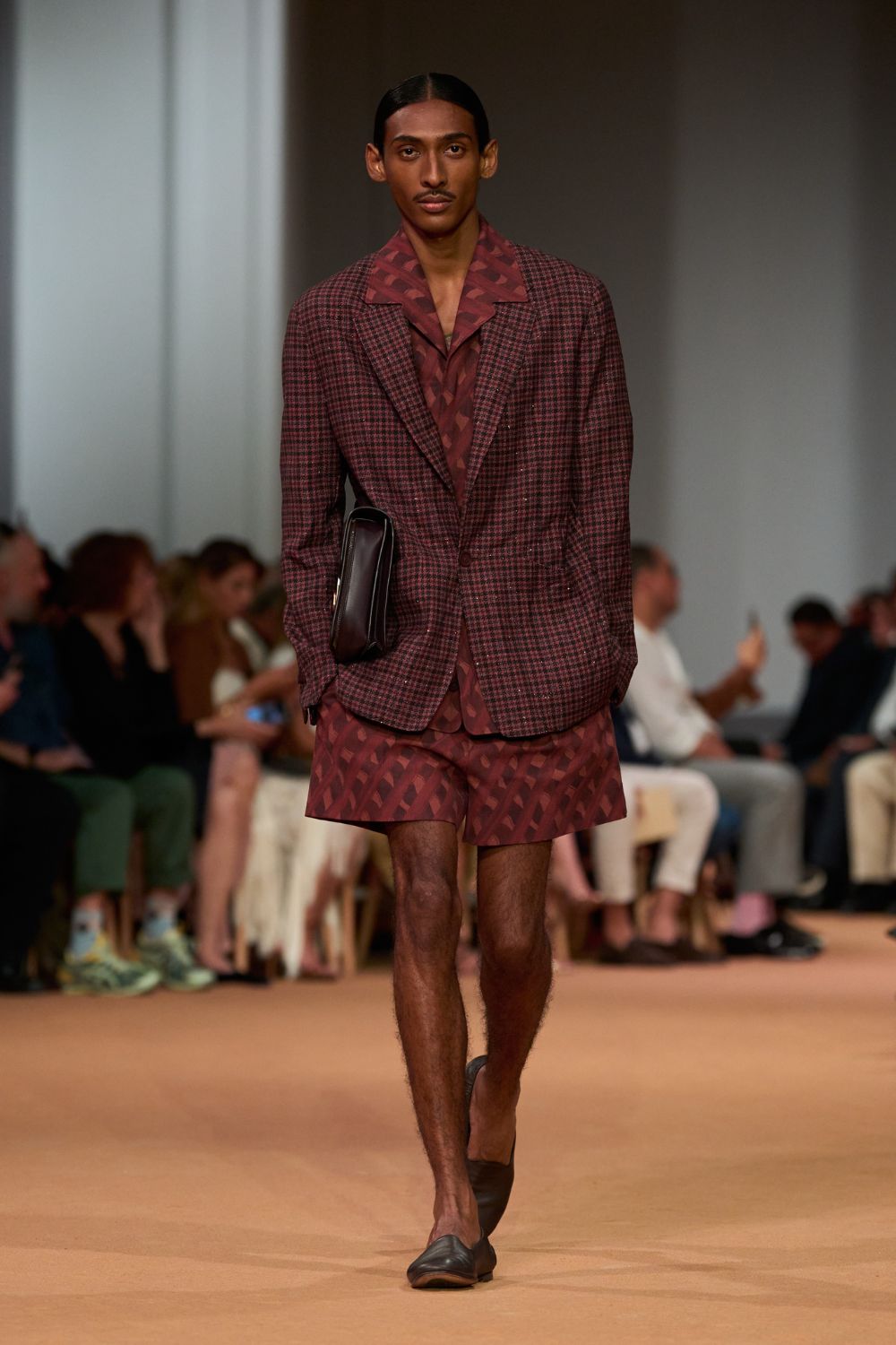 Não é que Sartori tenha inventado a roda: os mocassins molengões, os slippers e as mules são clássicos do repertório masculino há tempos, mas a maneira de carrega-los é que faz a bossa toda: na mão, no bolso das jaquetas de linho utilitárias, deixando os pés descalços caminharem despretensiosamente na areia terrosa, ou mal calçados, com o calcanhar pisado, como chinelos, mesmo. A alfaiataria, levíssima, adaptada ao calor local ou ao planeta assolado pelas mudanças climáticas, segue apostando nas formas amplas, desconstruídas e confortáveis, com calças e bermudas pregueadas de gancho baixo, em cores vivas como rosa ou verde-floresta, além de padronagens clássicas em pied de poule, rejuvenescidas pelas texturas e pela atitude nonchalante.